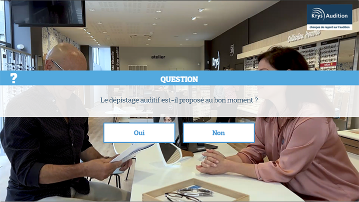 Le dispositif prend la forme d’un parcours e-learning interactif composé de 4 modules, chacun correspondant à une étape clé du dépistage auditif. Chaque module repose sur des films à décision, intégrant des choix utilisateurs, des feedbacks pédagogiques et des situations réalistes en magasin. Les modules sont exportés au format SCORM, pour une durée comprise entre 15 et 30 minutes.