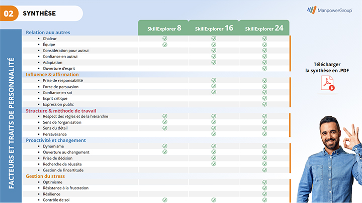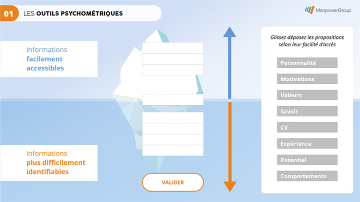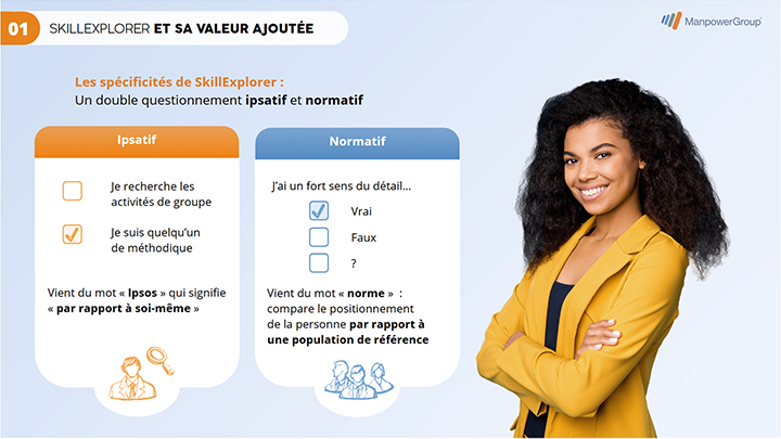 Les managers et professionnels RH ont besoin de données objectives pour accompagner les collaborateurs dans leur développement. Sans accompagnement, ces outils peuvent être mal compris ou mal utilisés, limitant leur valeur et leur fiabilité. Concevoir un parcours e-learning permettant de comprendre, utiliser et interpréter correctement les inventaires de personnalité, en s’appuyant sur l’outil SkillExplorer. Problématique